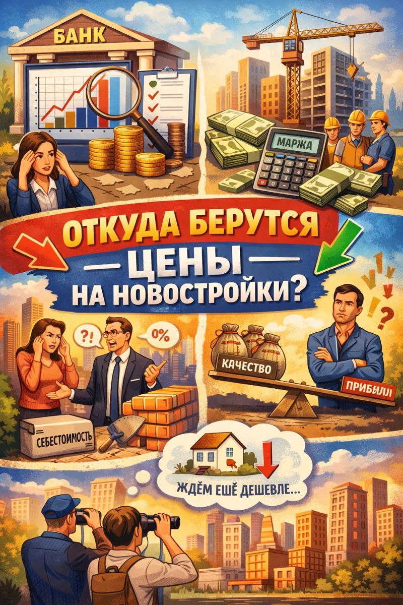 ? Очень часто слышу, как жалуются риэлторы и менеджеры отделов продаж на то, что клиенты отказываются от покупки, потому что ждут падения цен. Давайте разберемся в вопросе того насколько это возможно и как в реальности выглядит ценообразование у застройщиков? Когда застройщик планирует стройку, он примерно себе уже представляет какого класса объект он будет строить, а значит очень грубую первую примерку цен он делает опираясь на: - Себестоимость— участок, материалы, зарплаты, сети, маркетинг, офисы. - Конкурентов — что предлагают рядом. - Маржи — сколько он хочет заработать. Далее в игру вступает банк, который строит свою финансовую модель: выгодно ли кредитовать этот проект или нет. Что проверяет банк: смотрит историю продаж в регионе по аналогичным проектам, оценивает объемы продаж, рост цен соотносит стартовые цены и объем предложения с конкурентами и пытается спрогнозировать план продаж пытается спрогнозировать спрос с учетом общеэкономической обстановке в стране и в конкрет