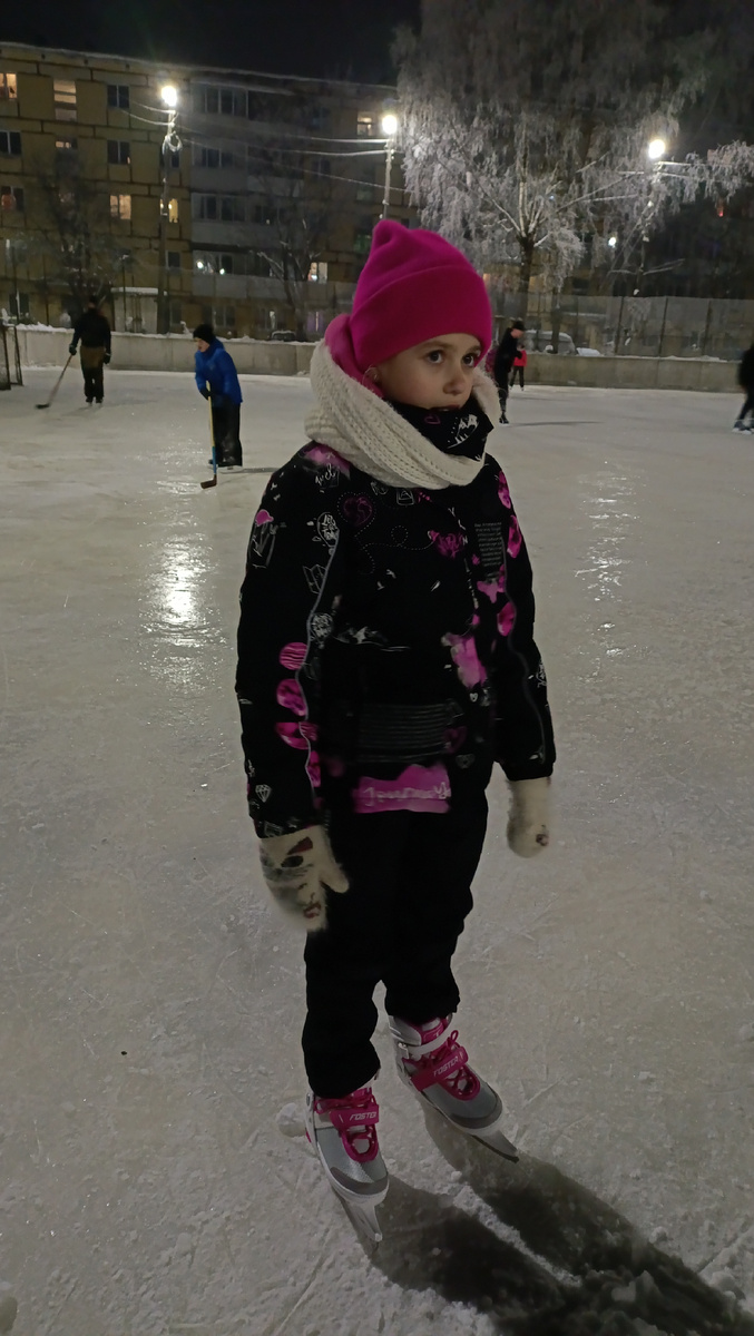 В центре кадра — юная фигурка в тёплой яркой одежде. Розовая шапка и коньки словно добавляют красок в холодный зимний пейзаж. Ребёнок уверенно стоит