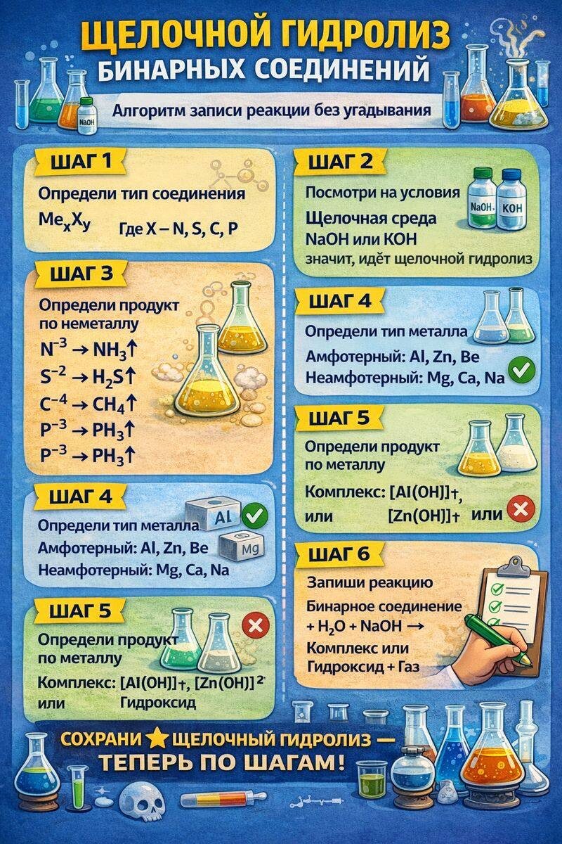 Чёткий алгоритм записи реакций без угадывания Чтобы правильно записать щелочной гидролиз бинарных соединений, важно не просто помнить продукты, аwhile понимать, какой неметалл какой газ образует. Разбираем по шагам. 🔹 ШАГ 1. Определи тип соединения Бинарное соединение имеет вид: MeₓXᵧ Где X — неметалл (N, S, C, P и др.). 🔹 ШАГ 2. Посмотри на условия Если указано: • щелочная среда • NaOH или KOH • щёлочь в избытке → идёт щелочной гидролиз. 🔹 ШАГ 3. Определи продукт по неметаллу Неметалл образует летучий гидрид, но важно учитывать его заряд. N³⁻ → NH₃↑ S²⁻ → H₂S↑ P³⁻ → PH₃↑ Углерод: C⁴⁻ → CH₄↑ C⁻ → C₂H₂↑ Это принципиальное различие, которое часто игнорируют. 🔹 ШАГ 4. Определи тип металла Теперь смотри на металл: • амфотерный: Al, Zn, Be • неамфотерный: Mg, Ca, Na и др. 🔹 ШАГ 5. Определи продукт по металлу Если металл амфотерный и щёлочь в избытке → образуется комплекс: [Al(OH)₄]⁻, [Zn(OH)₄]²⁻ Если металл неамфотерный → реакция идёт до гидроксида. 🔹 ШАГ 6. Запиши реакцию сразу