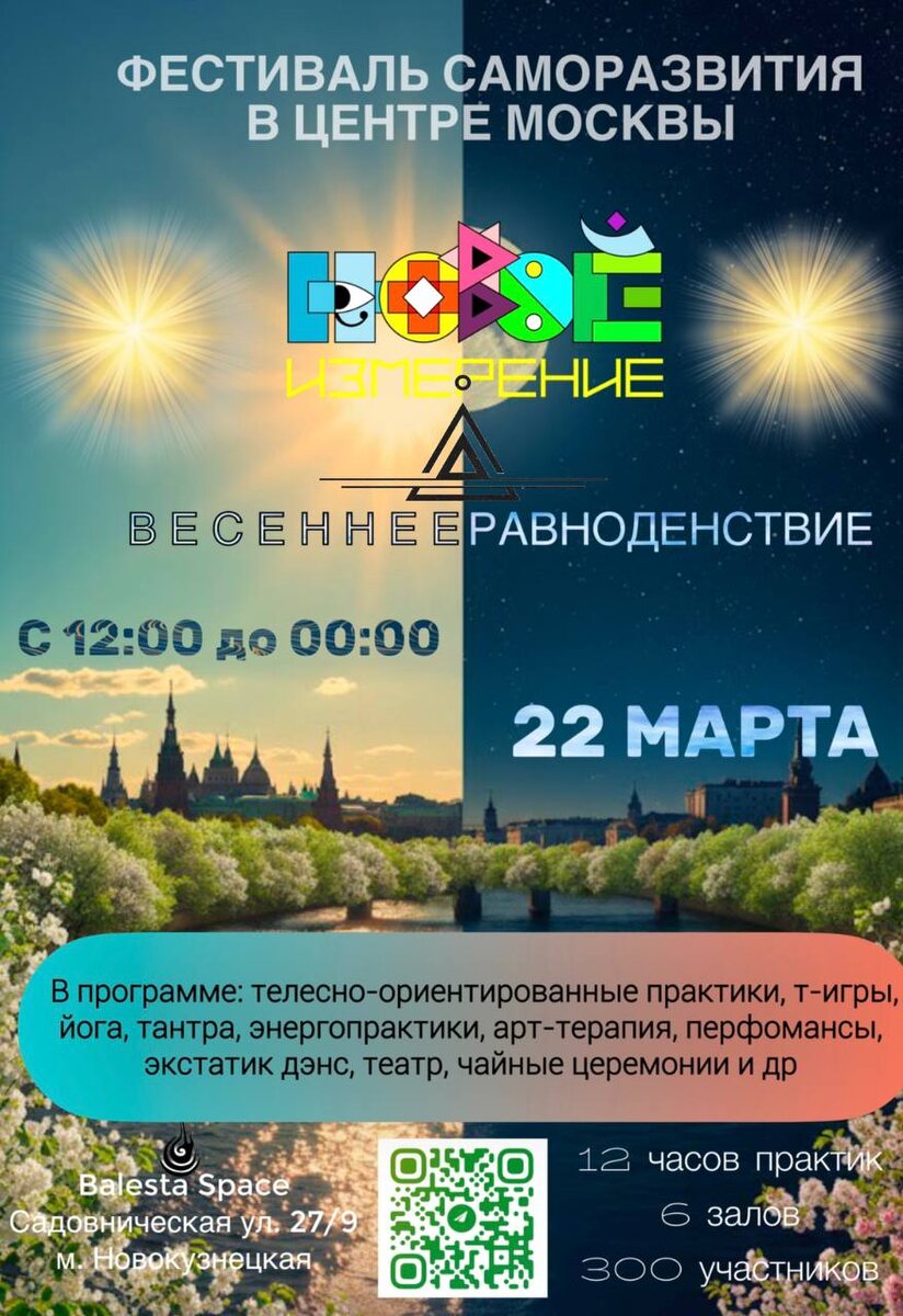 🤍 Весеннее равноденствие ☀️22 марта с 12:00 до 00:00 Москва. Садовническая ул. 27 / 9 (м. Новокузнецкая) 🤍Друзья, приглашаем вас снова встретиться с В самом сердце Москвы, в особняке Ballesta Space и традиционно отпраздновать магический день Весеннего равноденствия. ЧТО БУДЕТ? 1️⃣2️⃣ часов программы 6️⃣залов возможностей 3️⃣0️⃣0️⃣ участников и топовые мастера. Программа-путешествие: 😊 Зал практик и мастер-классов — телесно-ориентированные практики, арт-терапия, йога медитации и др. 😊 Зал Театра эмоций — перформансы, арт-Театр. 😊 Зал Танцевальная Вселенная — концерты, sound healing и ecstatic dance 🎲Зал Игропрактики — весь день глубинных трансформационных игр. 🫖 Чайный храм — chill out пространство и чайные церемонии 🤍 Маркет уникальных вещей созданные с душой 😊 Фуд-корт - вкусная и полезное еда. Приглашаем ведущих/мастеров/играпрактиков представить свои мастер-классы. Подробности @mossyulia 😊БИЛЕТЫ самая первая стоимость Промокод Новое Измерение 😊 Купить БИЛЕТ со скид