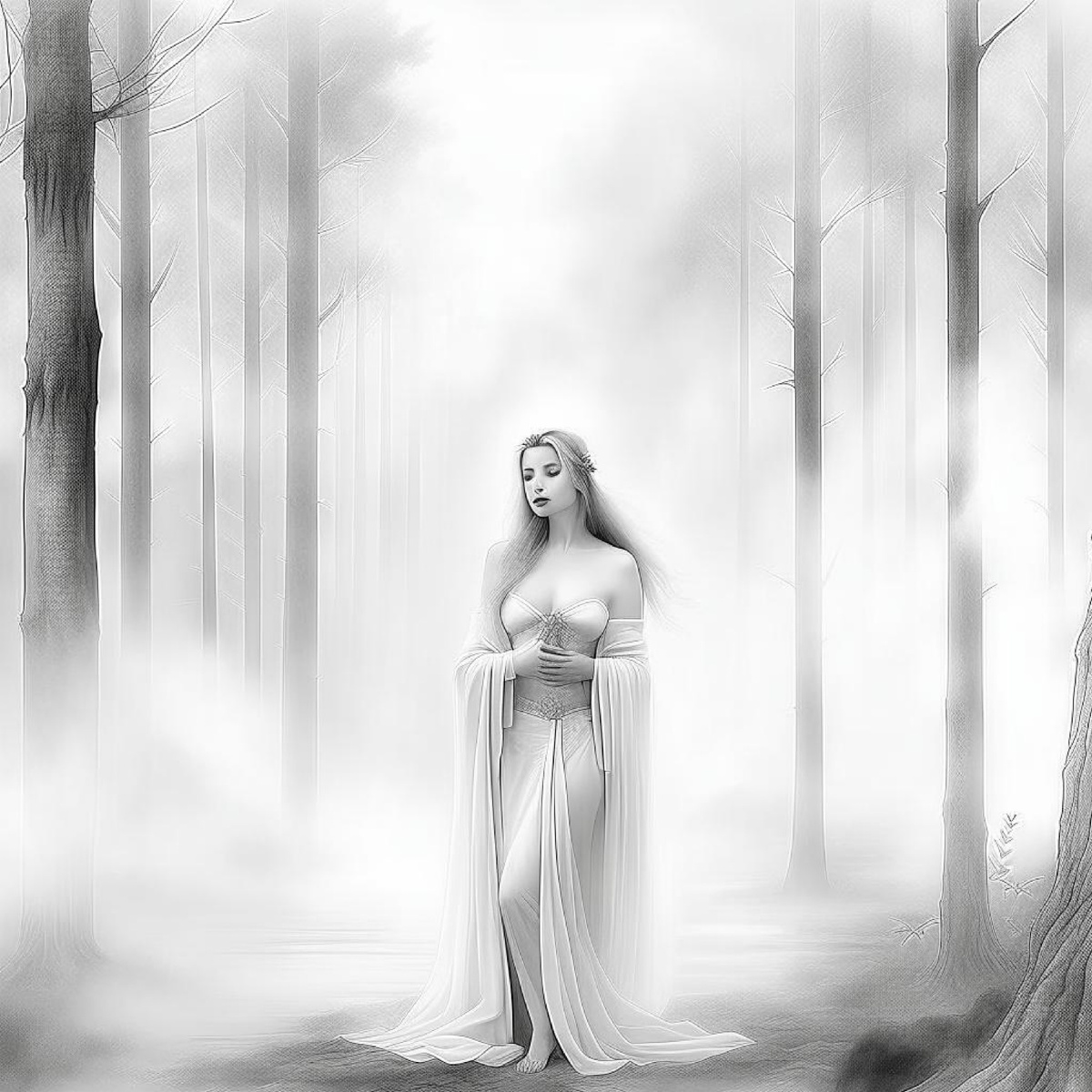 Луч звезды ударил прямо в туманный вихрь, который под его влиянием сложился в фигуру прекрасной, воздушно-эфемерной девушки. В длинном белом сарафане, расшитом зеленой и серебряной нитью – как нитями тумана по траве.