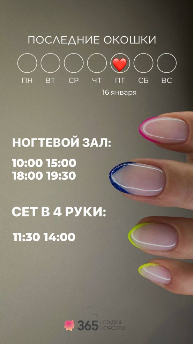 💞 Завтра пятница - значит, впереди выходные 🍕🏠🎉 Время расслабиться, набраться сил и создавать уют вокруг себя 😍 #красота #наслаждение #забота #зима #любовь #мечты сбываются #радость #возможности ЧТО МОЖНО УСПЕТЬ СДЕЛАТЬ 16 января 2026 года: Ногтевой зал: 10:00 15:00 18:00 19:30 Сет в 4 руки: 11:30 14:00 Парикмахерский зал: 10:00 12:00 15:30 20:00 Оформление бровей и ресниц: 12:00 15:30 19:30 Косметология/шугаринг: 12:30 15:30 18:00 20:00 ЗАПИСАТЬСЯ МОЖНО ЛЮБЫМ УДОБНЫМ СПОСОБОМ: 👉🏻 Сообщение в Whats'app https://wa.me/79663654477 👉🏻По телефону +79663654477 👉🏻Онлайн запись https://n286444.yclients.com/ #команда365 #красота #наслаждение #забота #зима #январь #любовь #мечтысбываются #радость #возможности