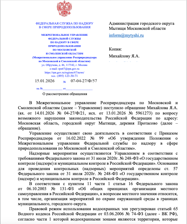 Росприроднадзор России поручил проведение проверки по фактам нарушения природоохранного законодательства Долиной администрации Мытищ