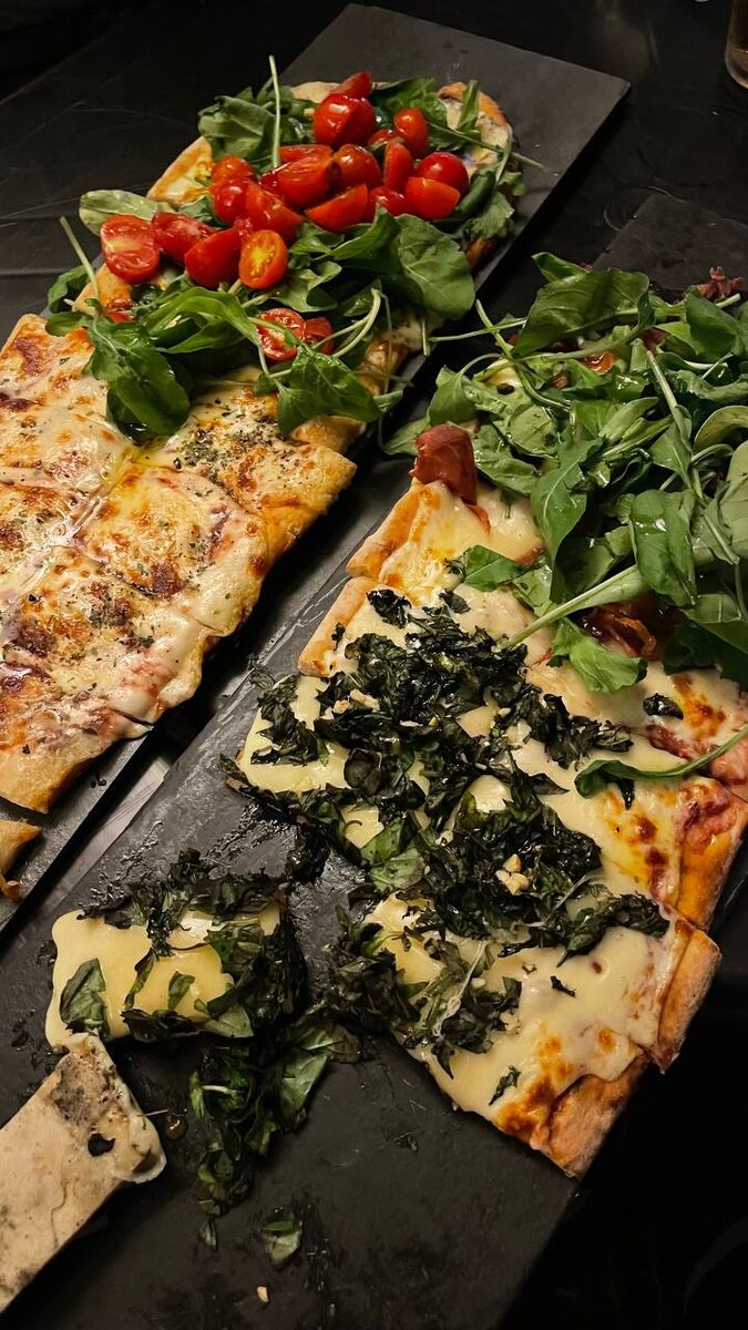 … Кафешка делает «итальянские пиццы», размеры 0,5 метра и 1 метр ( т.е. две по 0,5) .. д Запеченное только тесто с сыром. Тесто понравилось, пекли в печке, видимо это и делает пиццы «итальянскими» 🤭 На верхней - кучка помидорок, которые добавлены после печи. А на нижней - целый пучок нарезанного базилика с чесноком.