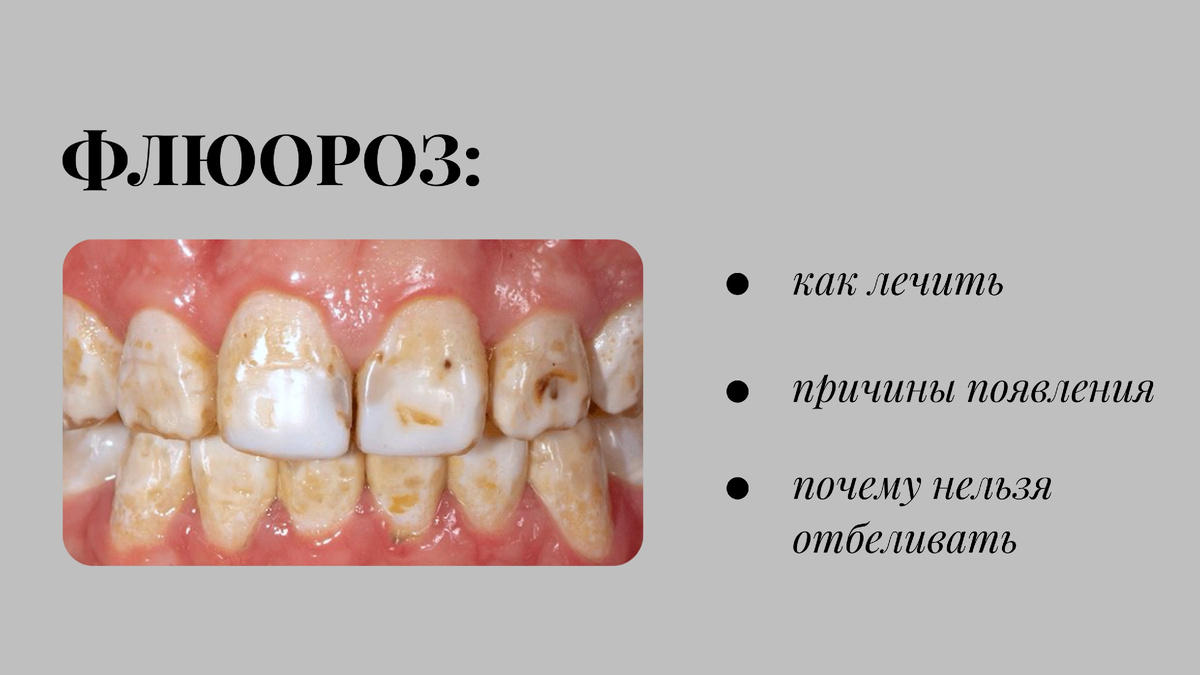 Когда «полезного» фтора в детстве было слишком много, появляется ОН — флюороз. Это не кариес и не плохая гигиена, это хроническое состояние эмали, которое формируется в период РАЗВИТИЯ ЗУБОВ. Да-да, те самые белые или коричневые пятна, которые НЕ исчезают после чистки — не особенность вашей эмали, это изменение внутри нее. ФЛЮОРОЗ ❌ НЕ заразен ❌ НЕ передается по наследству ❌ НЕ может появиться после 7-8 лет, когда эмаль полностью сформирована ❌ НЕ убирается чистками или медикаментозно НО: ⚪️ Он увеличивает развитие кариеса ⚪️ Усиливает разрушение зубов ⚪️ Провоцирует воспалительные процессы и пародонтоз Так чем же опасно отбеливание? Флюороз — не налёт. При отбеливании без диагностики пятна могут стать контрастнее, а эмаль чувствительнее. Поэтому здесь одной процедурой не обойтись, важна тактика! Подход к лечению зависит от степени: ⚪️ Лёгкие формы (на зубах просто меловые пятнышки, сам зуб гладкий) → В таком случае достаточно сделать реминерализацию, т.е. укрепить эмаль. Либо выполнит