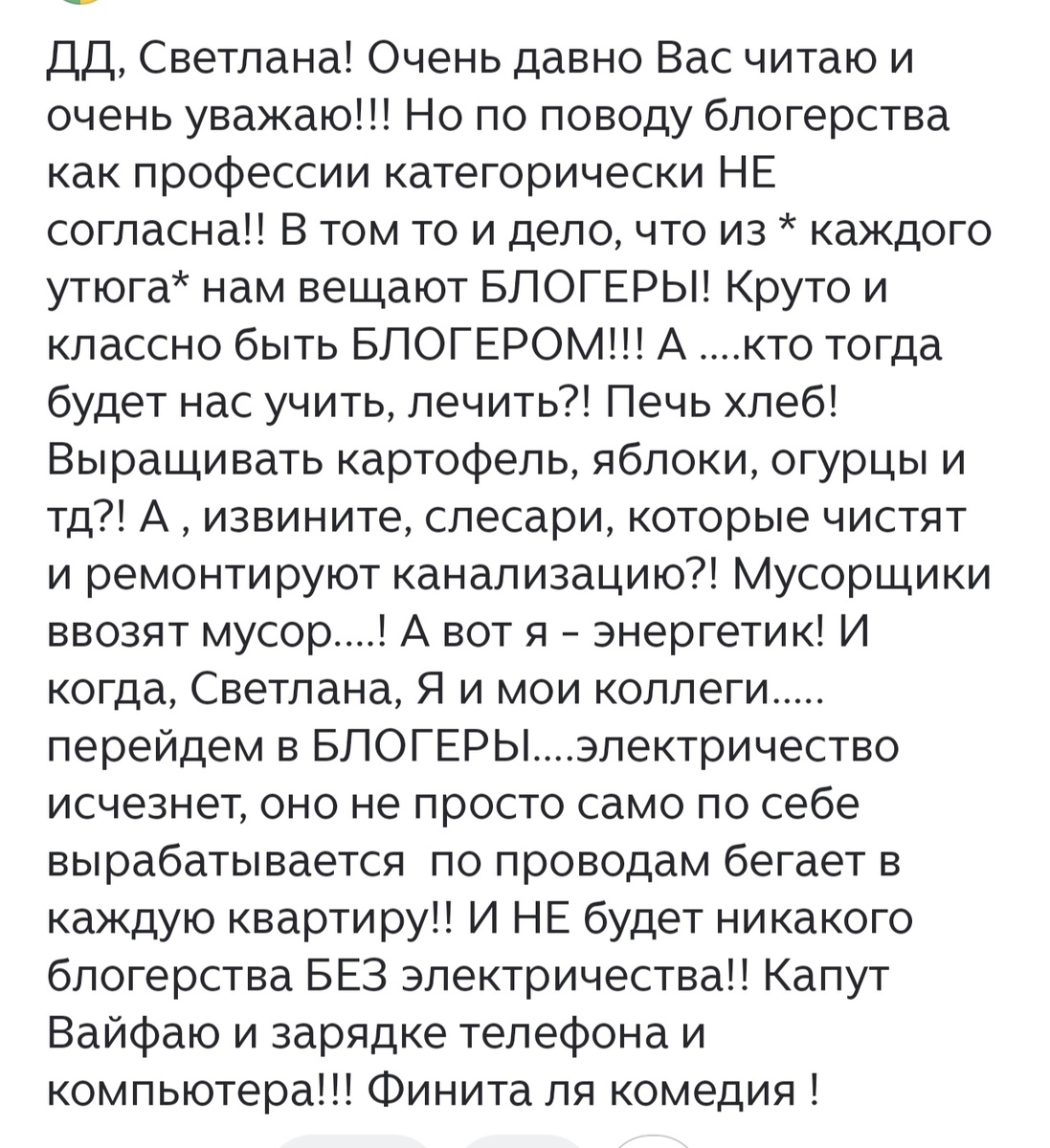 Я это пишу к тому, что не нужно сравнивать важность той или иной профессии. Без каких-то мы не можем прожить, без других можем. Захотел человек стать артистом, блогером или юристом - это его выбор. Но не все хотят играть на сцене. Кто-то осознанно выбирает лечить людей и никогда не захочет вести канал.