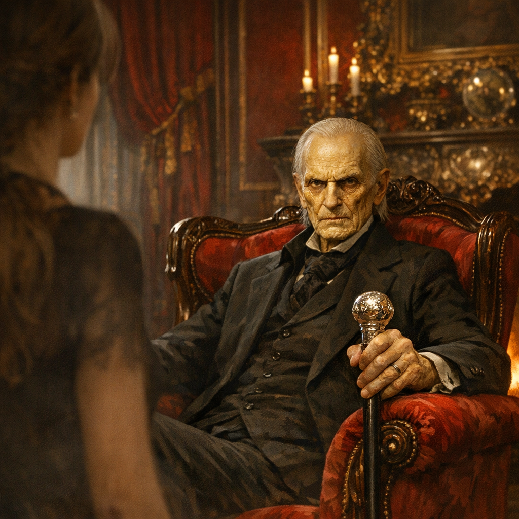 Красная гостиная, которую она раньше избегала из-за её помпезности, теперь казалась ловушкой. В кресле у камина, несмотря на тёплый день, сидел высокий, костлявый старик с лицом, словно высеченным из жёлтого мрамора. Он держал в руке тяжёлую трость с серебряным набалдашником, хотя, как она позже узнала, необходимости в ней не было. Это был символ власти. Его глаза, такие же серые, как у сына, но лишённые всякой глубины, холодно оценили её с ног до головы.
