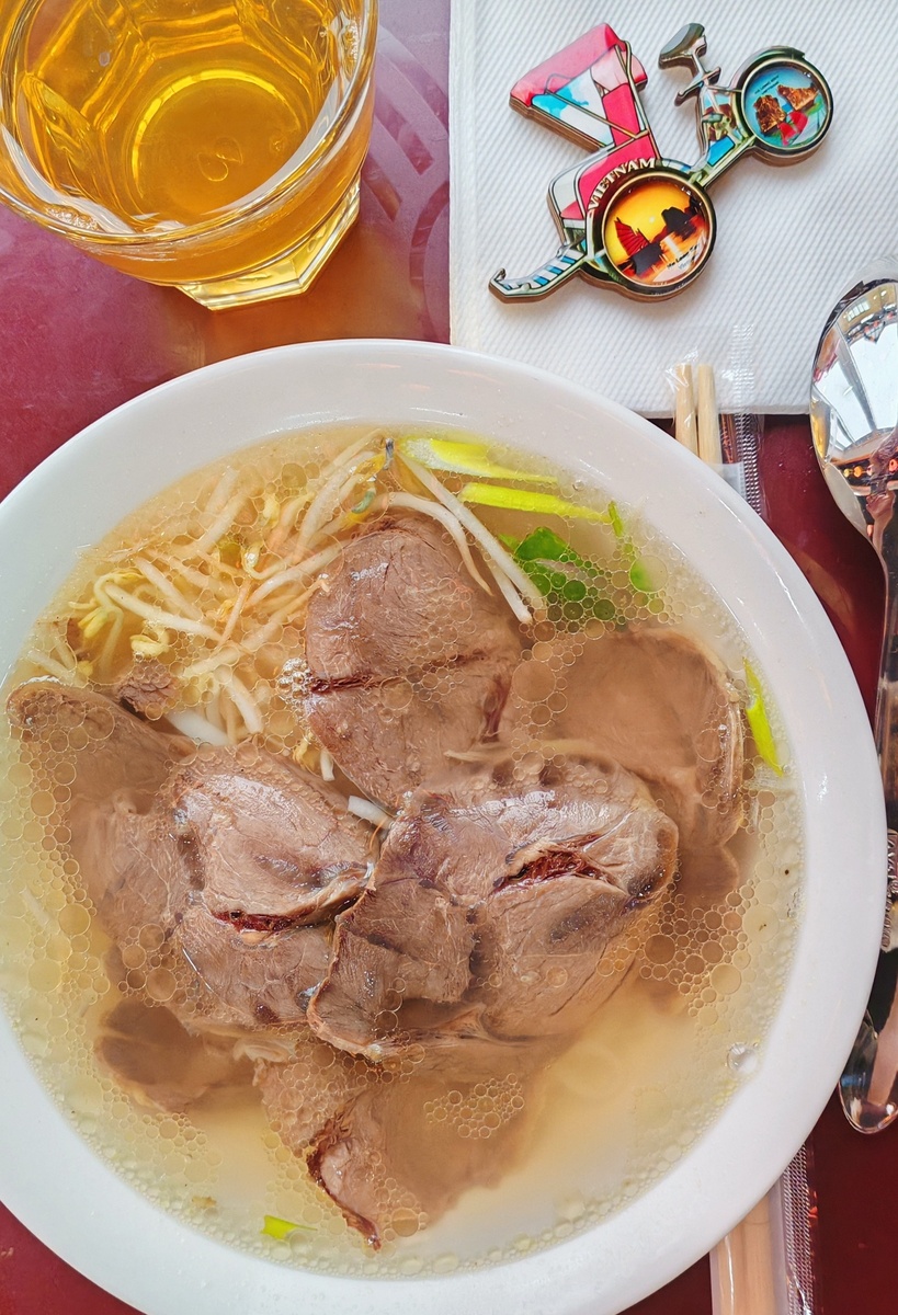 Очень сильный контраст после длительной прогулки по "грустному" городу и нахождением в совершенно новом и довольно аутентичном семейном ресторанчике, который своими яркими цветами в оформлении тут же поднимает настроение. Подойдя к стойке изъявляю свое желание отведать их вариант приготовления вьетнамской рисовой лапши с говядиной в бульоне, где в конце привычно для себя добавляю «То», что указывает на большой размер порции.