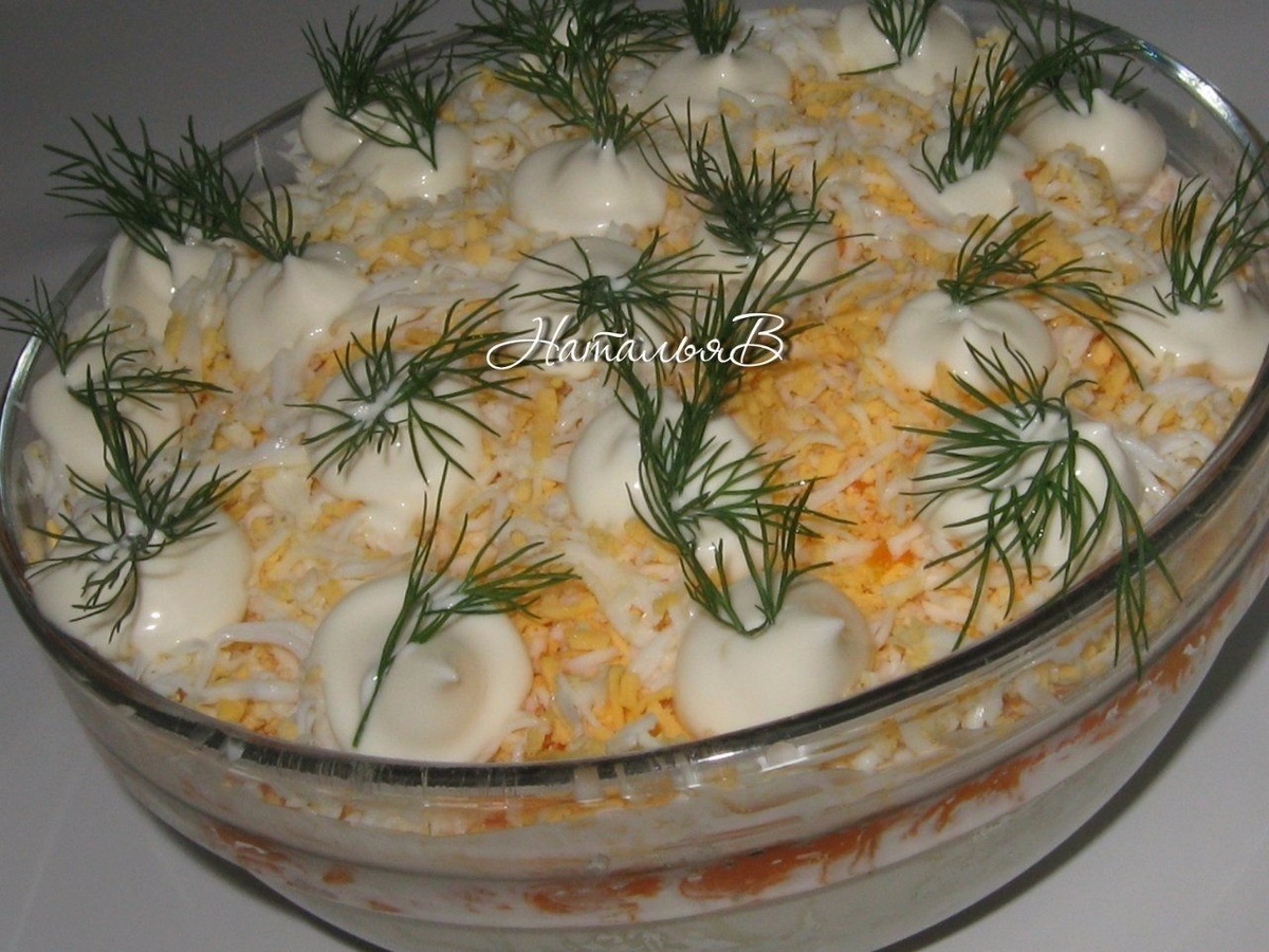 Сельдь очистить от костей и мелко нарезать. Овощи и яйца отварить, охладить, очистить. В салатник уложить слоями: сельдь - картофель(на мелкой терке) - морковь(на мелкой терке) - яйца( на мелкой терке), каждый слой промазывая майонезом, кроме верхнего, поставить в холодильник минимум на 1час. При подаче украсить укропчиком и каплями майонеза. Приятного аппетита!