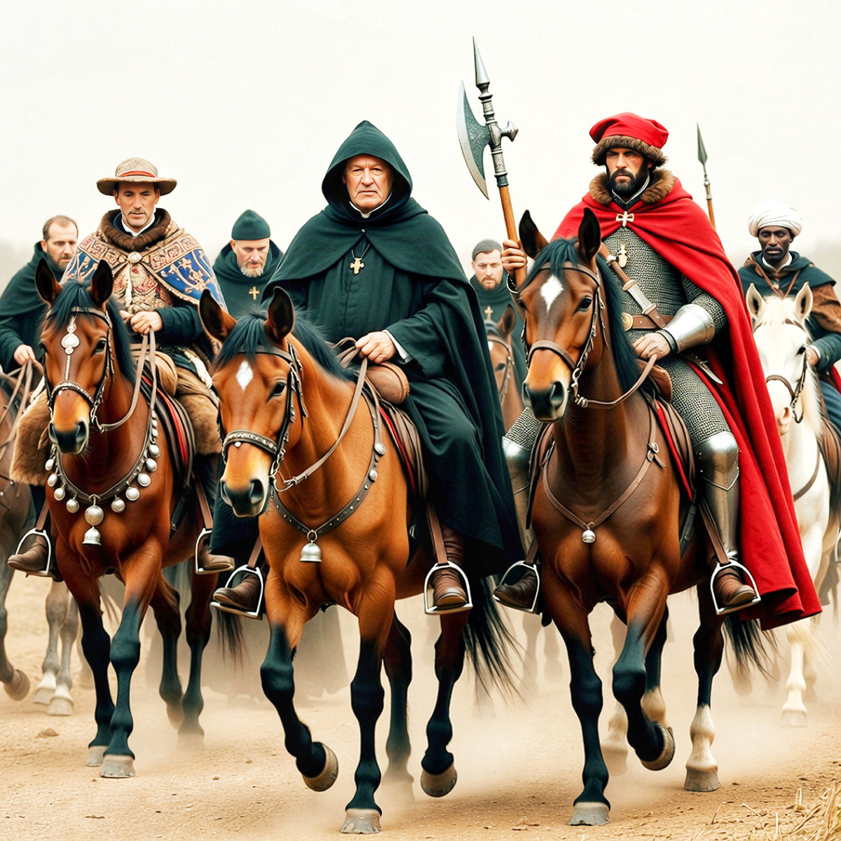 Прелат восседал на упитанном муле, двигавшемся плавной рысью. Упряжь мула была щедро украшена, а уздечка, следуя тогдашней моде, унизана серебряными колокольчиками. В его посадке не было ничего от монашеской неловкости – напротив, она выдавала уверенного и опытного наездника. Создавалось впечатление, что несмотря на удобство спокойной рыси и роскошное убранство мула, щеголеватый монах использовал это средство передвижения лишь для путешествий по дорогам. Один из слуг, мирянин, вёл под уздцы великолепного испанского жеребца, предназначенного для торжественных случаев. В те времена торговцы, рискуя многим и преодолевая бесчисленные трудности, привозили из Андалузии таких лошадей, пользовавшихся большим спросом у богатых аристократов. Седло и вся сбруя этого великолепного коня были накрыты попоной, спускавшейся до самой земли и вышитой крестами и прочими церковными символами. Другой слуга вёл в поводу вьючного мула, навьюченного, вероятно, личными вещами настоятеля. Позади всех ехали двое монахов того же ордена, но рангом пониже. Они оживлённо переговаривались и посмеивались, не обращая внимания на остальную часть процессии.