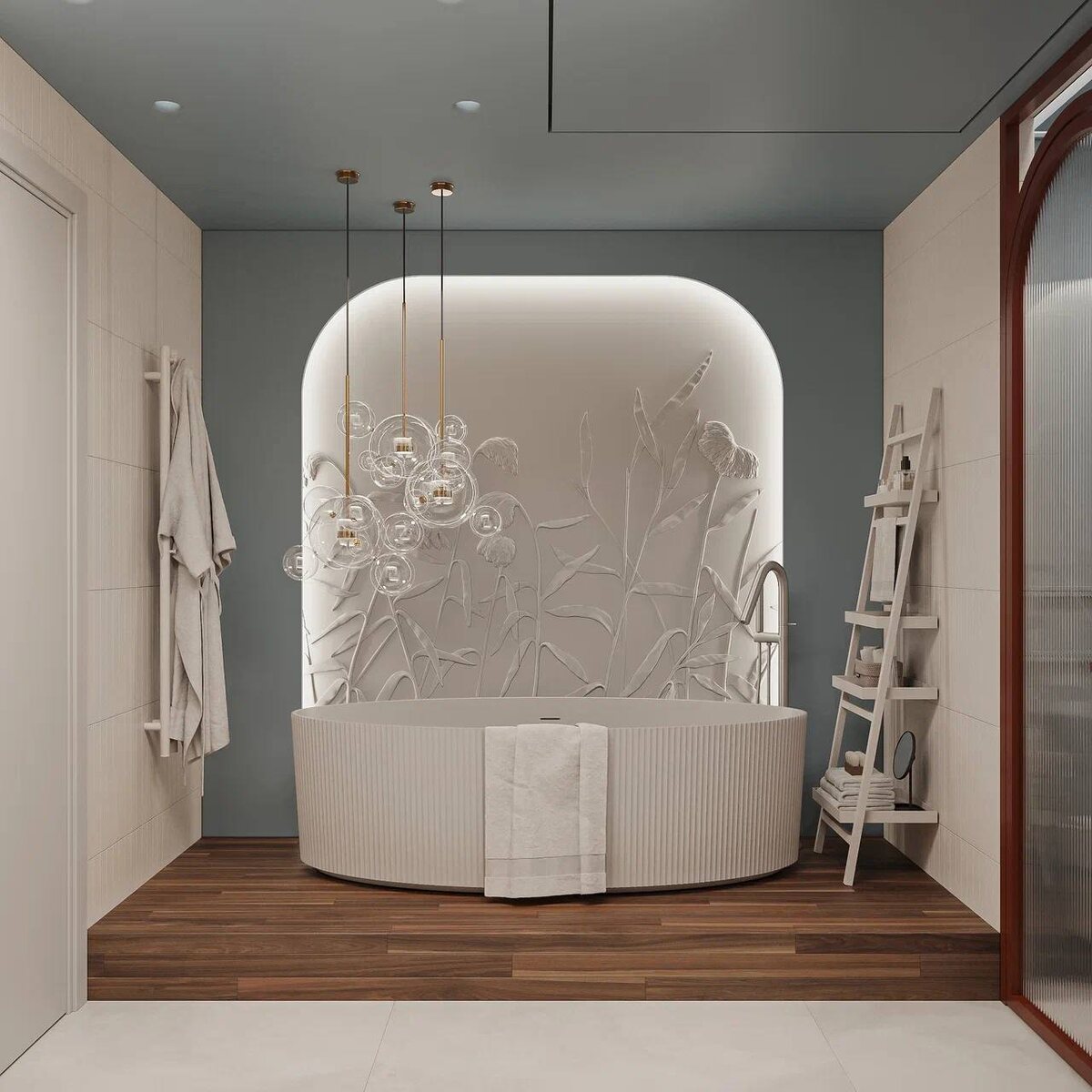 несколько глубинных потребностей. Вот почему это классное решение: 1️⃣В обычной квартире ванная — это проходное, функциональное помещение. Мастер-ванная, примыкающая исключительно к спальне, становится продолжением приватной зоны. Это место, куда вы не пускаете гостей. Где можно принять ванну при свечах и помедитировать 2️⃣Представьте: вам не нужно согласовывать график с домочадцами. Ваш утренний ритуал (душ, макияж, укладка) происходит в одном месте, не выходя из личной территории. Все вещи под рукой, никто не торопит. 3️⃣Здесь помещается не только душ и унитаз. Это место для: ✔️Отдельной ванны (наконец-то!). ✔️Двух раковин (чтобы не толкаться локтями). ✔️Большого островного или панорамного зеркала. ✔️Гардеробной зоны (разделся после душа - и сразу надел чистое). ✔️Туалетного столика с правильным светом. 4️⃣Все ваши косметические средства, полотенца, халаты находятся в одном, закрытом от посторонних глаз месте. Никаких чужих зубных щёток на вашей раковине. Идеальный порядок, пот