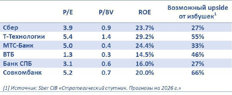 Избушки и частные инвесторы сходятся в том, что позитивно смотрят на финансовый сектор в 2026. Снижение ставки позволит нарастить темпы кредитования и снизить резервы, при этом, банки оцениваются довольно привлекательно. Давайте смотреть и выбирать наших фаворитов. Т-Технологии — главный фаворит аналитиков российского фондового рынка. Группа сохраняет высокие темпы роста чистой прибыли >40% г/г. и высокую рентабельность ROE 30%. Потенциал роста бизнеса будет продолжаться из-за увеличения клиентской базы и её более эффективной монетизации. Также стоит отметить, что при сохранении текущего ROE банк обладает высоким запасом прочности по капиталу. Из минусов — когда в идею верят все, обогнать рынок сложнее. Сбер — фундаментально привлекательная история. Компания продолжает демонстрировать стабильный рост чистой прибыли, платит дивиденды при этом торгуется дешево относительно других голубых фишек. МТС Банк — главный кандидат на переоценку при снижении ключевой ставки благодаря портфелю