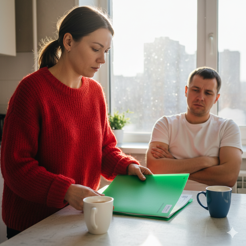 Дверь закрылась. Я стояла посреди прихожей с ключами в руке. И папкой с документами, которую я так и не показала. Она лежала на тумбе. Зелёная, яркая, как сигнал тревоги.