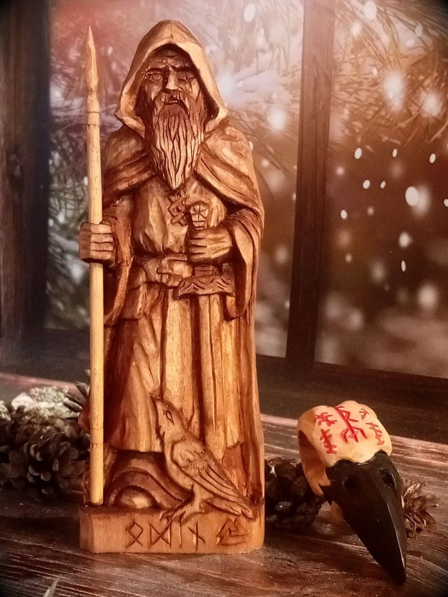 ! Завершила этот сложный и вдохновляющий заказ. Большинство в опросе угадали верно — это действительно Один, верховный бог скандинавского пантеона, странник, воин и мудрец. Работа получилась мощной и детализированной: • В руках — копьё Гунгнир • На плече — верный ворон • Капюшон и плащ, скрывающие лик вечного скитальца • Суровый и сильный взгляд Каждая черта вырезана с уважением к образу: это не просто фигурка, а воплощение мудрости, жертвенности и силы. Технические детали: ▫️ Рост: 22,5 см ▫️ Материал: липа ▫️ Покрытие: морилка на водной основе + льняное масло #Один #СкандинавскаяМифология #РезьбаПоДереву #ДеревяннаяСкульптура #Кумир #Оберег #Ворон #РучнаяРабота #Липа 👇 Как вам воплощение? Чувствуете суровую северную энергию? 🔥 P.S. Такого стража можно заказать для своего дома — пишите в личные сообщения!