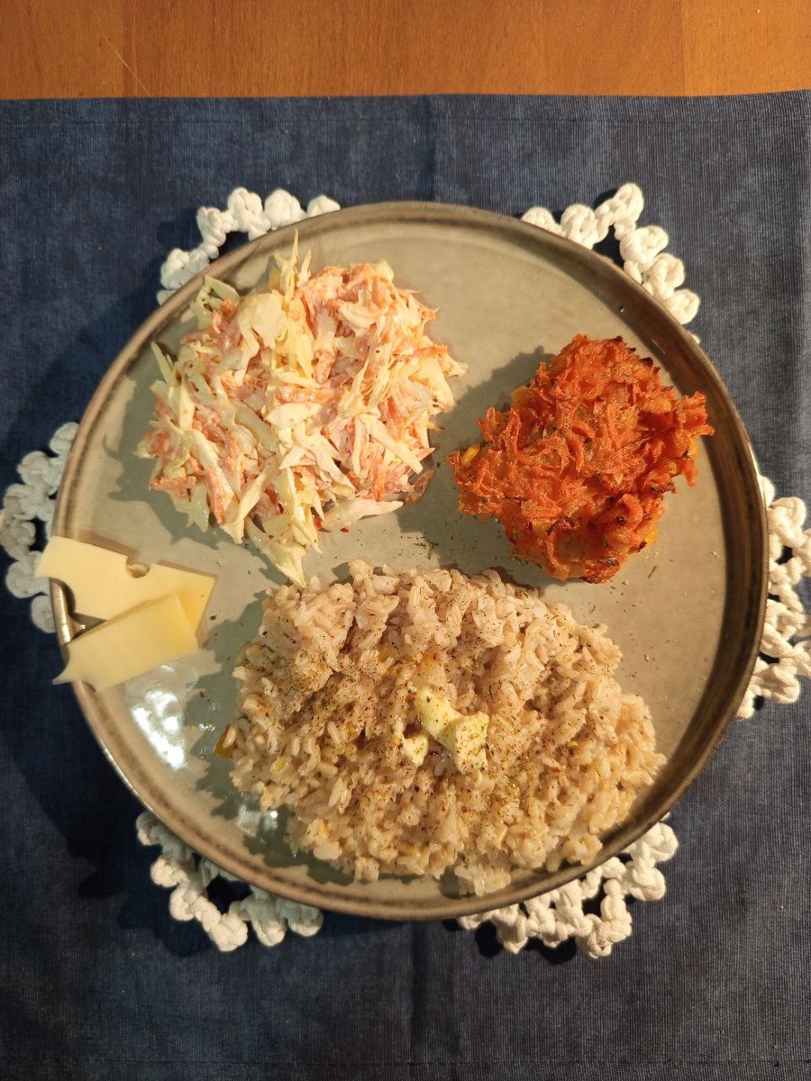 Рыбный, кстати, к нашему недавнешнему разговору Этот ужин я бы еще назвала ленивым, так как моего времени реального, где я задействована всего минут 15-20 ❤️Из чего состоит: ❤️Клетчатка, овощи - ❤️Морковно-капустный салат ❤️Белок - Минтай под морковно-луковой шубой в сметанной заливке ❤️Жиры - Кусочки сыра, льняное масло ❤️Углеводы - Рис бурый со специями и льняным маслом 👉Первым я ставлю вариться рис, так как бурому нужно минут 25-30 до готовности. Варю его я в мультиварке, чтобы не стоять у плиты и не мешать, залила, поставила на режим крупы и забыла 👉В это время готовлю зажарку для рыбы - морковь и лук зажариваю до золотистого цвета на сковороде, приправляю 2-3 ложками сметаны и любимыми специями, буквально мин 5-7 и зажарка готова 👉Достаю рыбу, можно прямо из морозилки. У меня это порционные куски минтая из Ленты (289 руб), чистить не нужно, не воняют, без костей Кладу сразу в предварительно застеленную пергаментом емкость, чтобы потом не мыть особо,посыпаю специями для