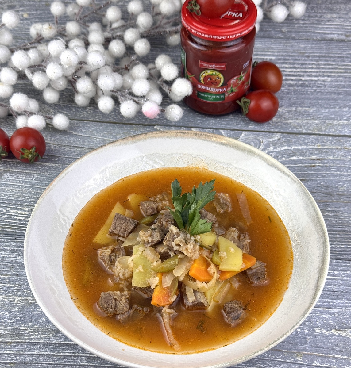 Зимой суп — это не просто обед, а лучший способ согреться после долгой прогулки. Мы предлагаем немного изменить классический рецепт и добавить в рассольник капусту и томатную пасту «Помидорка». Суп получится более густым, сытным, а томатная паста придаст бульону красивый яркий цвет и ту самую приятную кислинку, которая идеально сочетается с солеными огурцами. Говядина — 500 г