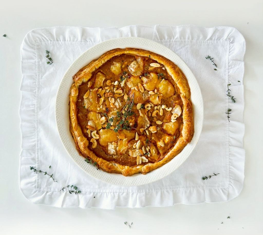 Хочется приготовить что-то элегантное, как в ресторане, но без лишних хлопот? Этот слоеный тарт — именно то, что вам нужно. Нежнейшая кабачковая икра «6 соток» создает идеальную основу для сливочного сыра бри и хрустящих орешков кешью.