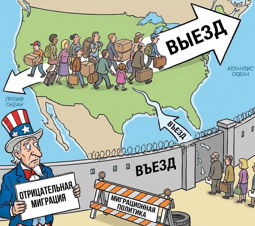 📉 Свежий отчет Brookings Institution подтверждает: в 2025 году число покинувших Штаты превысило приток новоприбывших. Жесткая реформа администрации Трампа привела к сокращению выдачи рабочих виз и резкому росту депортаций. Эксперты отмечают, что «американская мечта» теряет привлекательность - теперь квалифицированные кадры всё чаще выбирают Европу и Канаду 📊. 💬 Мексика начала экстренно укреплять стену со своей стороны, чтобы поток беженцев из Техаса не обрушил им рынок недвижимости.