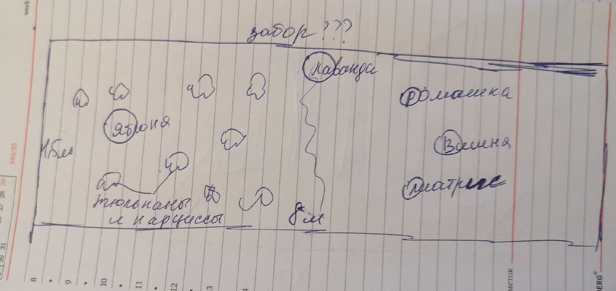 По одной стороне идёт забор с соседями, которого пока нет, с другой я не знаю, но думаю, что тропинка точно будет. На участке растёт яблоня и вишня, там, где вишня, посажен лиатрис и ромашки. Кустик лаванды не совсем поняла, где. Земля каменистая. Территориально можно посмотреть на карте