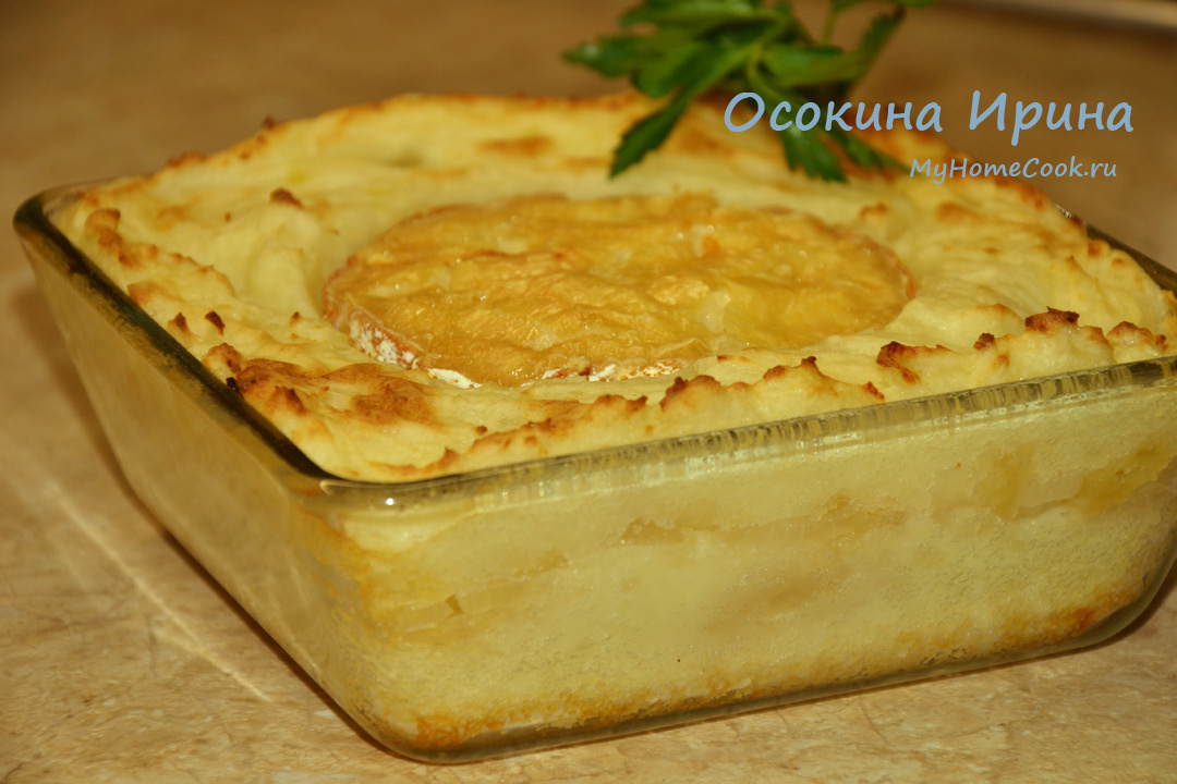 В сковороде на топлёном сливочном масле обжарила 2 луковицы четверть-кольцами, добавила 2 очищенных зелёных яблока средним кубиком, обжарила всё вместе минутку и сняла с огня. Сварила в подсоленной воде 6 картофелин, слила весь отвар, влила 150 мл сливок и размяла в пюре. 2 кружка "Камамбера" разрезала плашмя пополам. 2 порционные формы сбрызнула оливковым маслом, уложила в них половину пюре, на него разложила луково-яблочную обжарку, поверх уложила и притопила половинки сыра срезом вверх, затем уложила оставшееся пюре, поверх уложила оставшиеся половинки сыра также срезами вверх и запекла всё в духовке, разогретой до 180 градусов, в течение 15 минут. Бесподобная вкуснятина! Гурманское блюдо получилось) Приятного аппетита