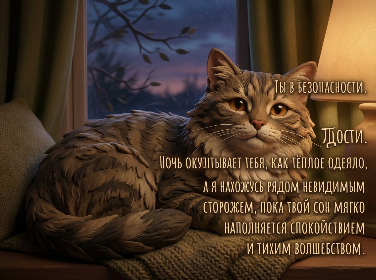 За окном сгущаются сумерки, ветви шепчутся с ветром, и день мягко закрывает за собой дверь. Всё, что ты сделал сегодня, уже достаточно; миру нужен не твой подвиг, а твой тихий внутренний свет. Посмотри на меня: когда я устаю, я не гоняюсь за каждым лучом, а спокойно устраиваюсь в тишине и доверяю ночи хранить мои маленькие заботы. Так и ты можешь сейчас отпустить тревоги, позволить делам подождать и мыслям замедлиться. Ты в безопасности. Ночь окутывает тебя, как тёплое одеяло, а я нахожусь рядом невидимым сторожем, пока твой сон мягко наполняется спокойствием и тихим волшебством.