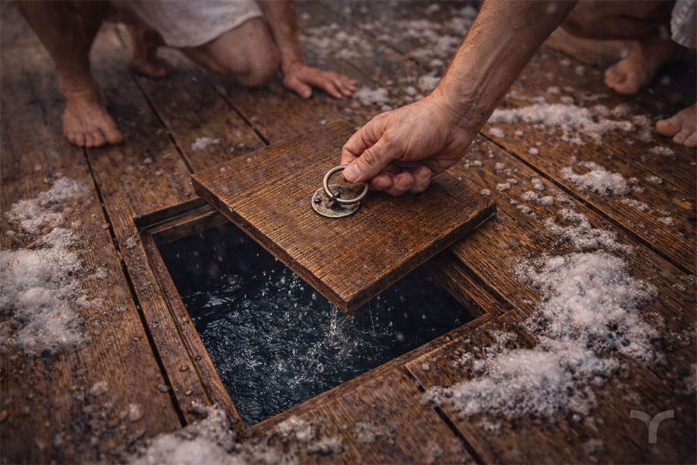 Потом посмотрели вниз. Лючок был из дерева, как и всё вокруг: аккуратный, квадратный, пример