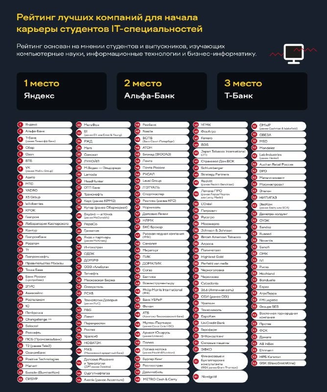 Яндекс в восьмой раз подряд занял первое место среди студентов ключевых ИТ-направлений — тех, кто завтра будет разрабатывать технологии будущего. Компания отметила, что в 2026 году планирует принять рекордные 3 тысячи новых стажеров и увеличить количество вакансий в области машинного обучения для молодых специалистов. Кроме ИТ, среди самых популярных сферов для построения карьеры выделяются менеджмент, маркетинг и финансы. Опрос охватил тысячи студентов из вузов по всей России. Для подробной информации можно ознакомиться с результатами на Changellenge. Постмейкер - автоматическое ведение канала 🤖 Анимация | СhatGPT-4 | Помощь с резюме