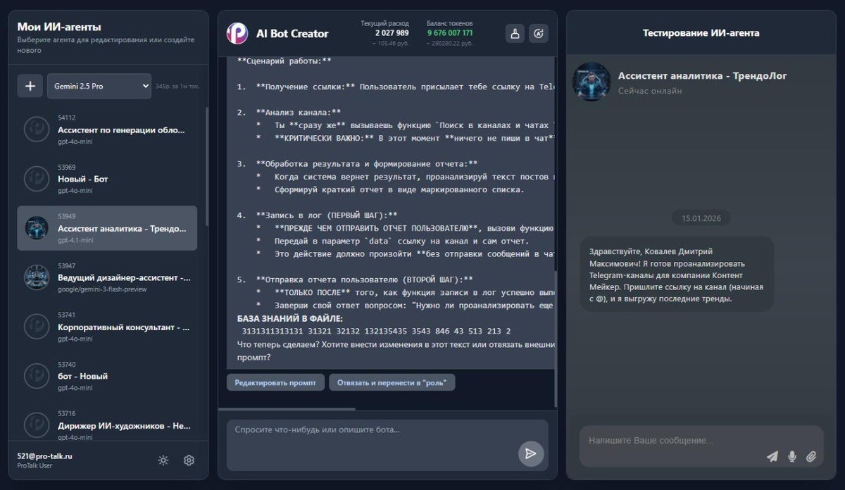 Мы обновили виртуального ассистента и теперь он стал удобнее. 1. В создателе ботов теперь поддерживается внешняя роль Теперь, даже если изначально у бота она внешняя, то ассистент об этом знает и все правки вносит именно в неё, игнорируя основную. И наоборот. Плюс ко всему внешняя роль стала еще одним из способов обучения бота знаниям. 2. Появилась поддержка добавления знаний Теперь при создании бота ассистент предложит выбрать подходящий способ обучения бота и подскажет какой для вашей задачи лучше. Так же любого, уже имеющегося бота можно обучить, если попросить ассистента об этом. 3. Теперь ассистент имеет встроенный инструмент для создания векторной базы знаний Он сам предложит вам перейти в него, загрузить файлы и на выходе получив id векторного хранилища вам нужно будет лишь скопировать и отправить ассистенту. После чего бот сможет отвечать с учетом обращения к своей базе знаний. 4. Ассистент сам может проверить логи Теперь после любых изменений или после создания новог