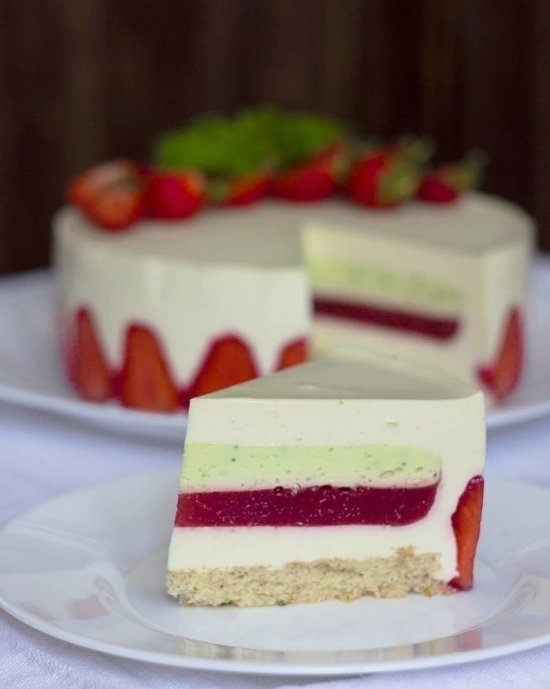 Очень освежающий летний торт! Идеальное сочетание клубники, базилика и лайма делает его очень запоминающимся и выделяет из большинства других. Абсолютно не приторный, сладости в меру. Пока не закончился сезон клубники – порадуйте своих близких:)