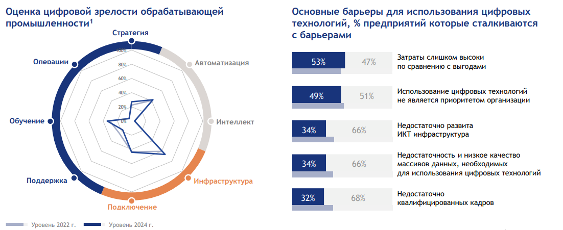 В обрабатывающей промышленности распространяется стратегический подход к цифровизации, при этом доля предприятий, отметивших высокие затраты как ключевой барьер выросла с 49% до 53% с 2022 по 2024 гг.