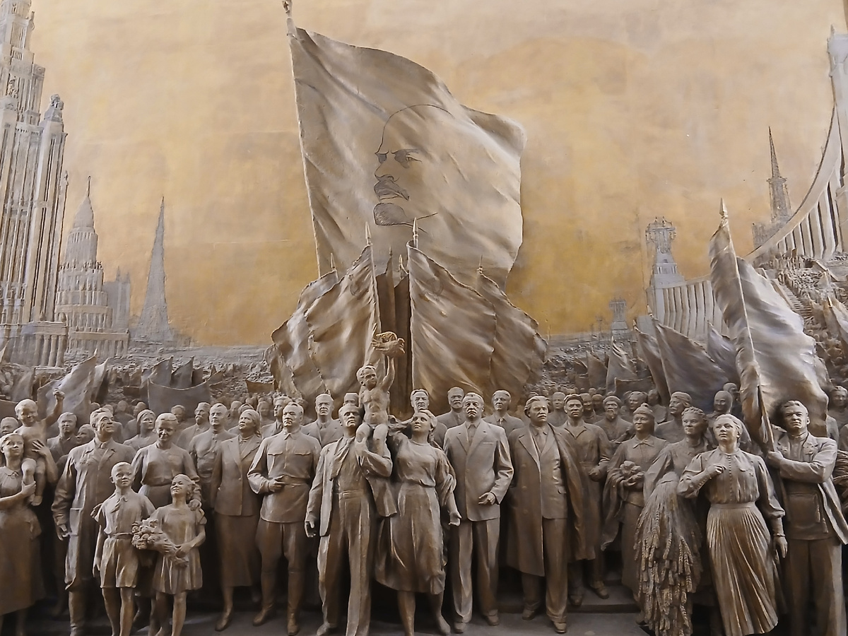 Если вы готовы попасть в портал во времени и хотите увидеть советский народ в период его яркого триумфа, то отправляйтесь на ВДНХ, в павильон "Центральный", чтобы стать свидетелем настоящего чуда: вам навстречу в праздничном ликовании стройными рядами выйдет советский народ, ставший одним из героев выставки "Образ Москвы в русском искусстве из коллекции Государственного Русского музея". О выставке я расскажу отдельно. Она работает до 1 февраля, и всем, кто ещё не видел её, настоятельно советую посмотреть на Москву глазами художников разных эпох. Отреставрированный павильон "Центральный" тоже достоин вашего внимания, но лично для меня настоящим потрясением стал горельеф Е. Вучетича "Знаменосцу мира - советскому народу слава!", созданный в 1954 году. Скульптор-фронтовик Евгений Викторович Вучетич известен прежде всего такими шедеврами, как "Воин-освободитель", поставленный в Трептов-парке Берлина, и "Родина-мать зовёт!", венчающая Мамаев Курган Волгограда. В течение нескольких лет, по