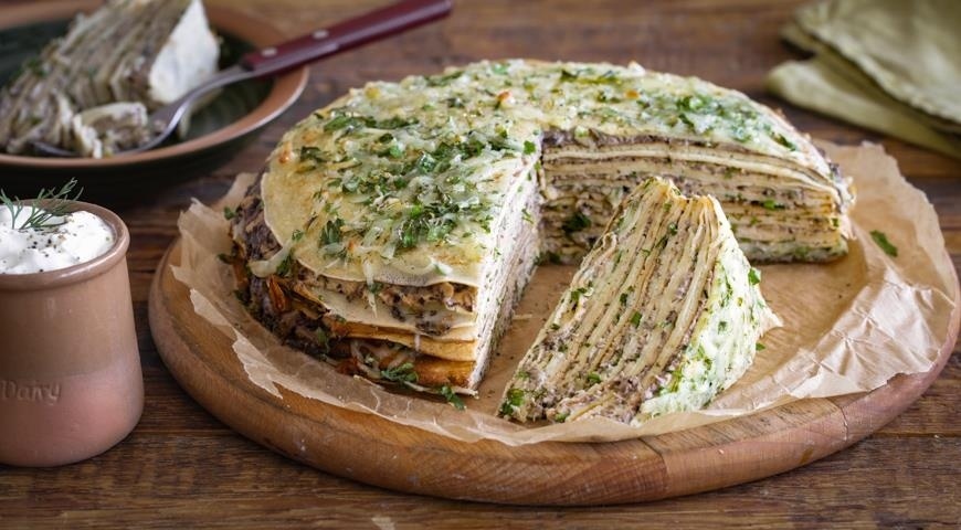 7. Соберите “торт”, выкладывай по одному блинчику в застеленную пергаментом круглую глубокую форму и выкладывая попеременно грибную начинку или посыпая сырной. Самым верхним слоем должен стать сыр;