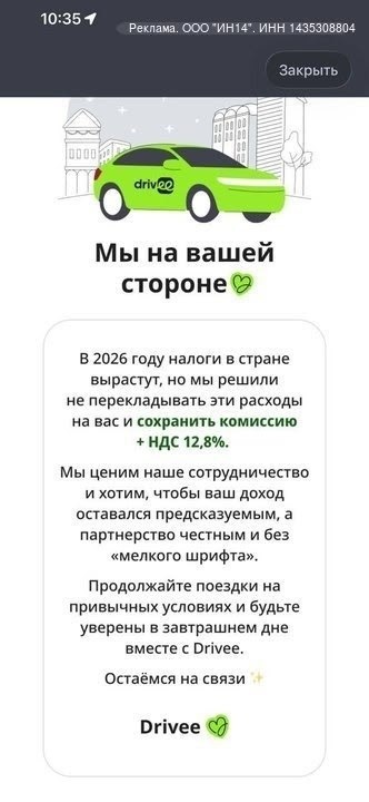 Обычно в такие моменты бизнес просто поднимает цены. И пока рынок обсуждает повышение налогов, Drivee пошёл другим путём. Комиссия сервиса для водителей, включая НДС, в 2026 году остается 12,8%. Без повышения. Без перекладывания на партнёров. Многие компании уже заложили рост НДС в стоимость услуг и увеличили сборы с партнёров. Drivee выбрал другой сценарий, потому что считает, что в любой ситуации важно сохранять человечность и поддерживать своих. Доступность и выгода поездок важнее попыток компенсировать налоговые изменения. Водители здесь не просто «инструмент», а основа сервиса. В текущих реалиях это редкий пример того, как сервис берёт внешние издержки на себя ради сохранения лояльности сообщества. Без громких заявлений. Кажется, именно так и выглядит здоровое партнёрство.Иногда честность — это не лозунг, а отказ повышать процент, когда очень хочется. ____ 📢 Подписывайся 👉 Канал | Аварийка LIVE | ДТП и ЧП России 💬 Общайся 👉 Чат | Обсуждения и новости ДТП