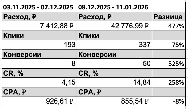 % В конце ноября ко мне обратился клиент. Занимается продажей осетинских пирогов. Пекарня находится в Люберцах и основные заказы приходят отсюда. Клиент хотел увеличить количество заказов и выйти на территорию Москвы (юг, юго-восток, восток). Проблемы: 1. Мало продаж 2. Неэффективная реклама 3. Падение заказов из Директа Задачи: 1. Повысить продажи 2. Выйти на новые территории 3. Сделать рекламу эффективной Что было сделано? 1. Настроил аналитику. На сайте два счетчика метрики и бардак в целях. Счетчики решил не трогать. На одном счетчике были настроены стандартные цели. Кампании оптимизировались по них и автоцели. Я настроил макро и микроцель на срабатывание JS-события, чтобы они лучше отрабатывали. 2. Собрал семантику. Расширил семантику. С помощью [квадратных] скобок избавился от автотаргетинга. Проработал минуса. 3. Запустил рекламную кампанию. Старую решил выключить. Поэтому собрал и запустил новую кампанию. Бюджет у клиента ограниченный, поэтому на старте решил собрать к