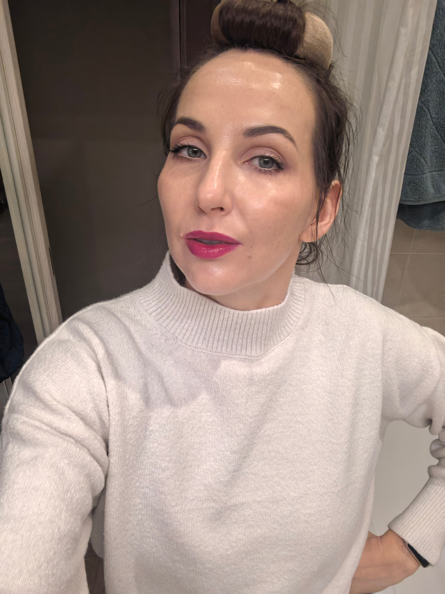 В общем, показываю. Мейк тут уже нанесен, но даже через тонкий слой тона виден именно этот глянцевый эффект. И он мне нравится.