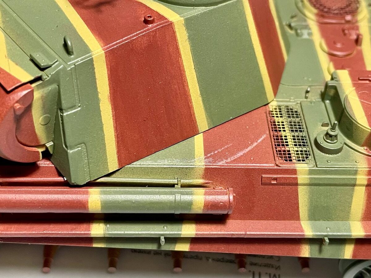 В ноября я остановился на том, что нанёс базовые цвета. К сожалению, из-за нехватки опыта и сложности рельефа модели (шанцевый инструмент был приклеен на этапе сборки), линии не везде получились одинаково ровными по тону, да и местами наслаивались друг на друга, мне потребовалось выравнивать их вручную - с помощью маскировочной ленты и кисточки. А ещё, то ли из-за того, что детали башни кривовато встали на места, то ли из-за толстого слоя краски, при повороте башни содралась краска на крыше корпуса: