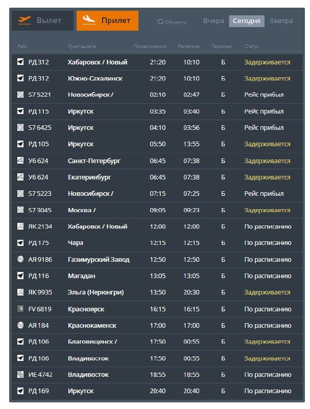 Судя по онлайн-табло аэропорта, задерживаются пять самолетов авиакомпании «ИрАэро», один от «Якутии» и один от S7 из Москвы. Вылеты тоже не укладываются в расписание: пассажиры ждут посадку на рейсы до Иркутска, Нерюнгри, Владивостока и Благовещенска. @chita.ru выясняет причины задержек. ➡️Если ваши близкие летят этими рейсами, напишите в @chitaru_welcome. Фото: сайт «АэроЧита» 🟦 «Чита.Ру» в MAX | Предложить новость