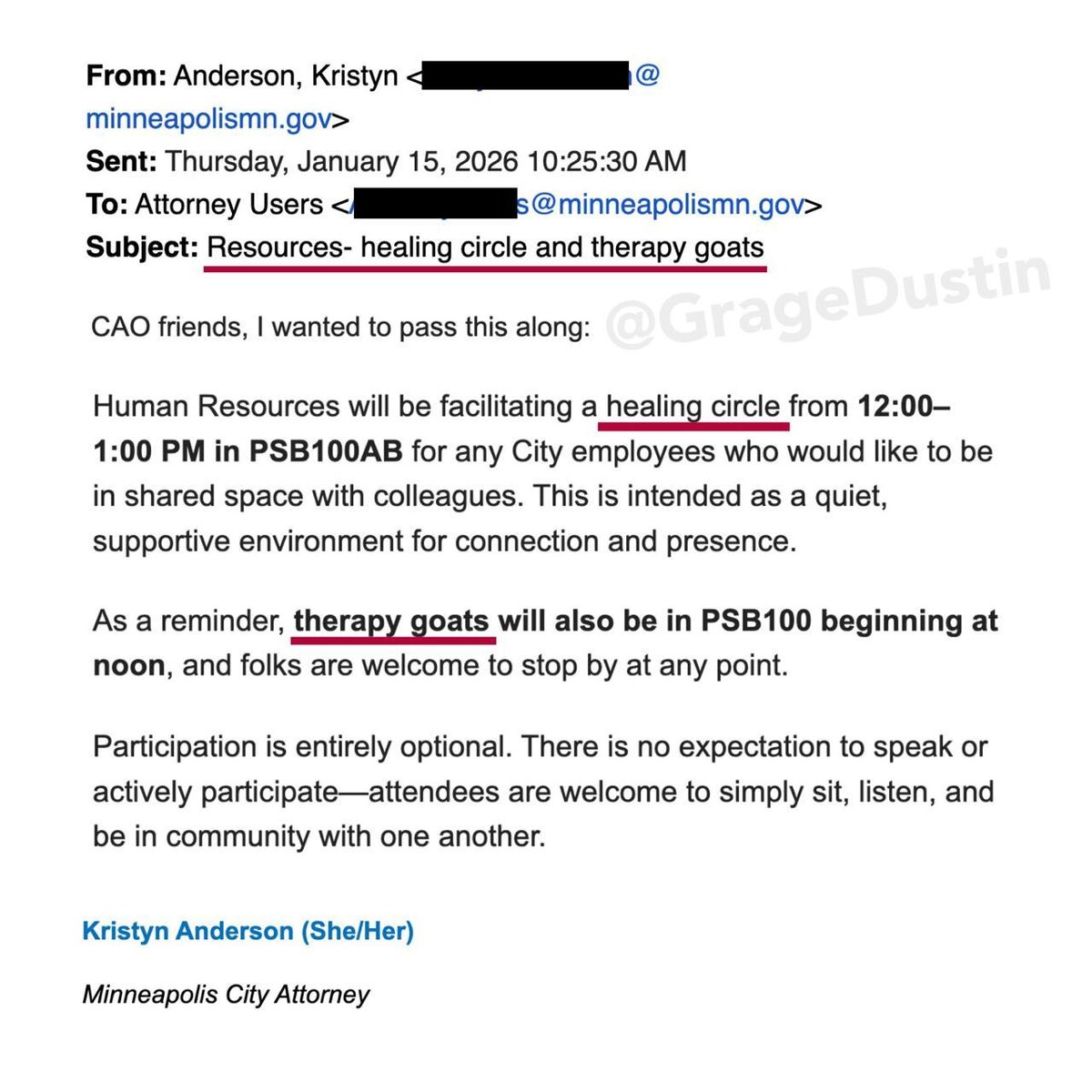The Minneapolis City Attorney’s Office is offering ‘THERAPY GOATS’ and a ‘HEALING CIRCLE’ for city employees