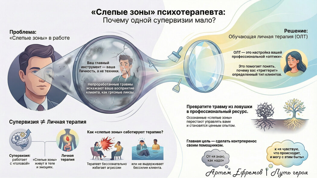 Представьте хирурга, который заходит в операционную с немытыми руками. Абсурд? Безусловно. Но в нашей профессии мы часто совершаем похожую ошибку: идем к клиенту с непроработанным, «загрязненным» собственными аффектами бессознательным. Мы привыкли думать, что главный инструмент психолога — это техники, модальности и знания. Но правда в том, что единственный инструмент психолога — это его собственная Личность. И если оптика этого инструмента искажена, мы будем видеть не клиента, а собственные отражения. Почему супервизии недостаточно? Супервизия — это гигиена процесса. Мы разбираем стратегию, гипотезы, динамику, перенос. Это работа «головой». Но наши «слепые зоны» живут не в голове. Они живут в теле, в эмоциональной памяти, в старых сценарных решениях. Супервизор может сказать вам: «Коллега, вы здесь проваливаетесь в слияние». Вы кивнете, поймете это когнитивно... и на следующей сессии снова провалитесь. Потому что этот паттерн — часть вашей непрожитой истории, до которой когнитивный ан