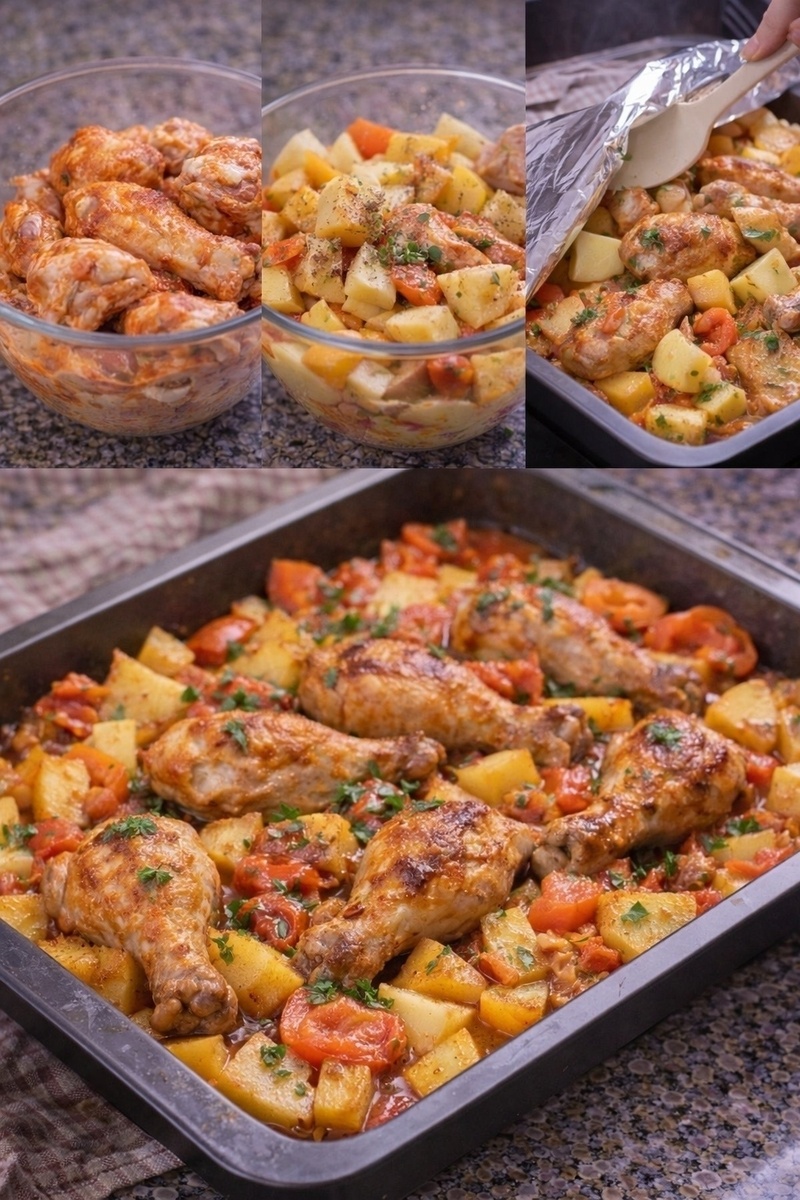 3⃣ Сверху выложите курицу, накройте фольгой и запекайте в духовке при 250 °C в течение 45 минут.