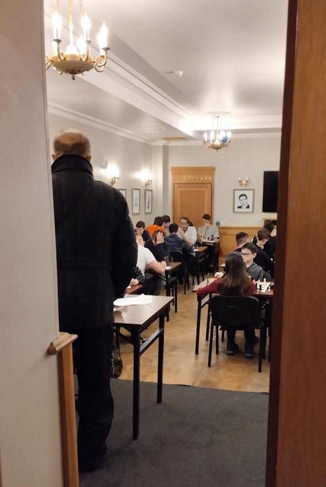 В новогодние праздники нам удалось вырваться из дома. Нам повезло - мы смогли попасть на экскурсию в особняк Васильчиковых-Оболенского-фон Мекк, который располагается на Гоголевском бульваре. Я ожидал в особняке степенность, тишину и покой. Но он нас встретил детской суматохой. Сейчас в особняке располагается Центральный шахматный клуб плюс зимние школьные каникулы - на первом этаже проводился шахматный турнир для школьников. В турнирном зале была тишина и шло "действо":