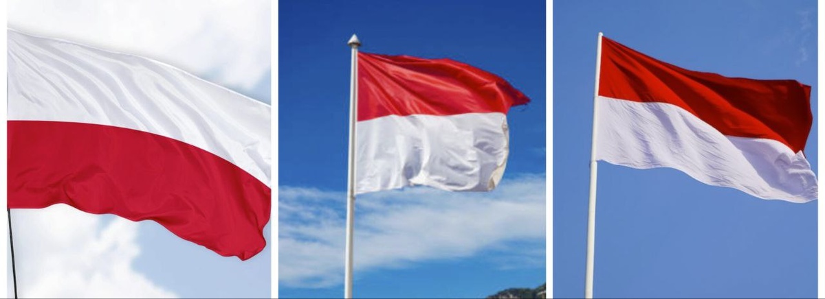 Думаю, что польский флаг узнали все — он самый левый: бело-красный. В серединке флаг Монако, а справа — Индонезии. Кажется, что это перевёрнутые польские флаги, и вообще они как будто бы одинаковые, но небольшая разница всё-таки есть. Во-первых, в пропорциях. Индонезийский флаг более вытянутый, у него пропорции 2 к 3. А у флага Монако полотнище с пропорциями 4 к 5. Ну и у индонезийского чуть более светлый оттенок красного. Хотя лучше ориентироваться на пропорции, а не на оттенки, которые сильно зависят от освещения.
