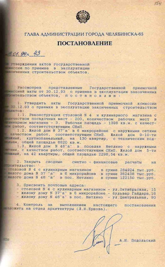 Как выглядели постановления первого мэра Озерска - А.Н. Подольского. Это было за № 43. Чётко, солидно, ответственно...
