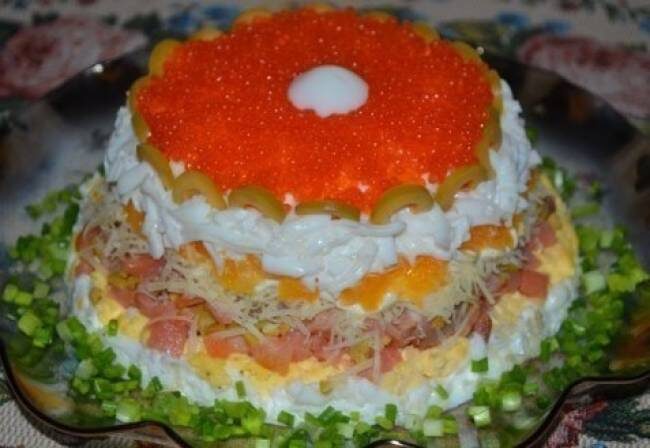 Салат выкладываем слоями. Первым слоем идет половина белков, смешанных со сметаной (солим и перчим по вкусу). Далее выкладываем желтки, солим, перчим по вкусу и немножко промазываем сметаной. Третьим слоем выкладываем половину семги и промазываем сметаной. Затем оливки и оставшуюся часть семги. После этого выкладываем сыр и немного сметаны. Следующим слоем кладем морковь, а поверх оставшиеся белки смешанные с сметаной (солим и перчим по вкусу). Салат украшаем икрой и оливками, а в центр кладем половинку перепелиного яйца.