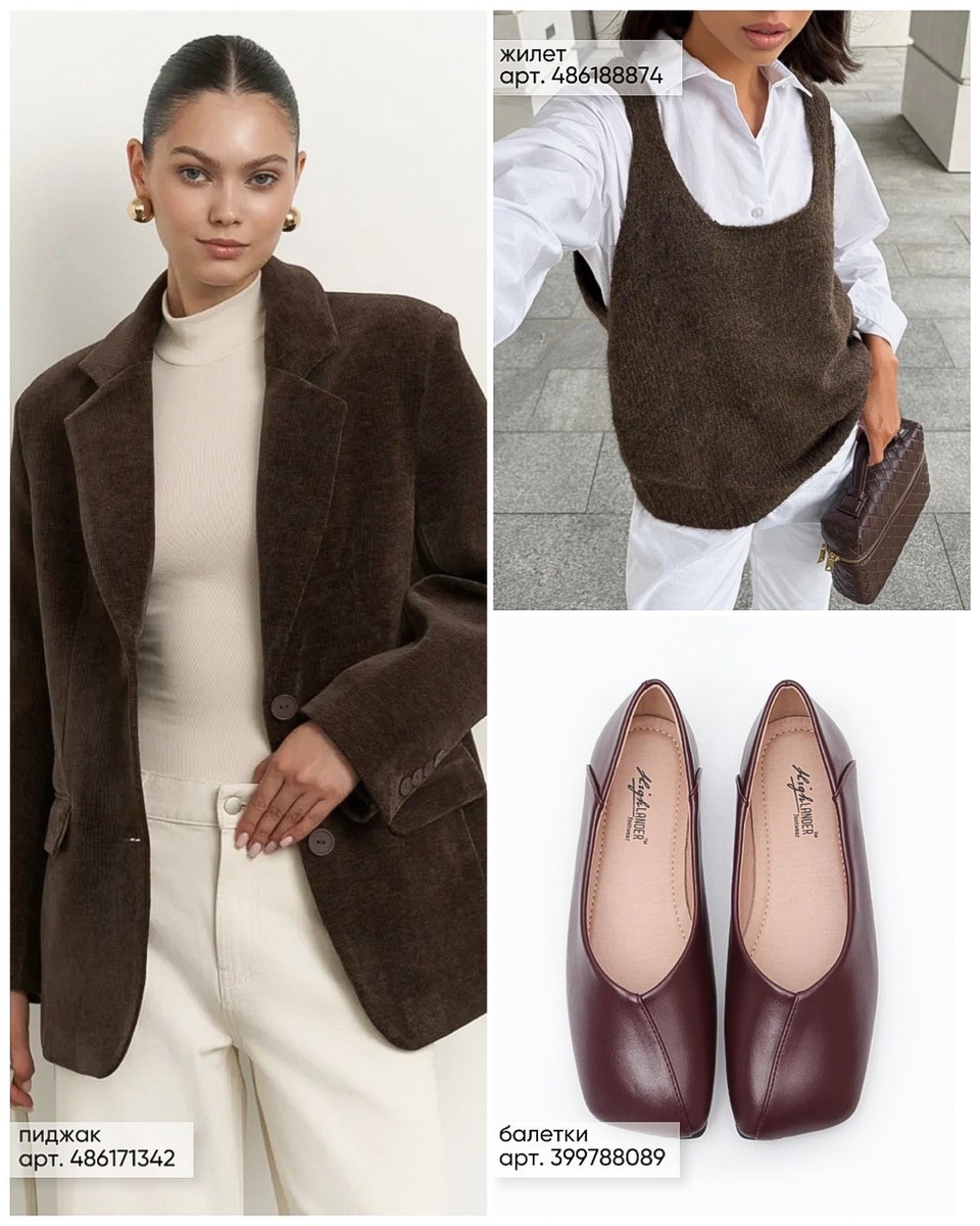 Эти находки легко собрать в цельный гардероб: шоколадный пиджак и жилет дают базу «умной классики», балетки и кардиган добавляют мягкую женственность, бомбер и массивные ботинки — городской характер, а леопардовая сумка и жёлтый жилет — ровно столько акцента, сколько нужно, чтобы образ запоминался.