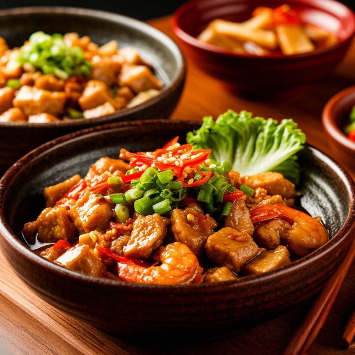 - Сычуань — акцент на остроте и «мутности» вкуса: сычуаньский перец даёт онемение (má), много перца чили и пикантных соусов.