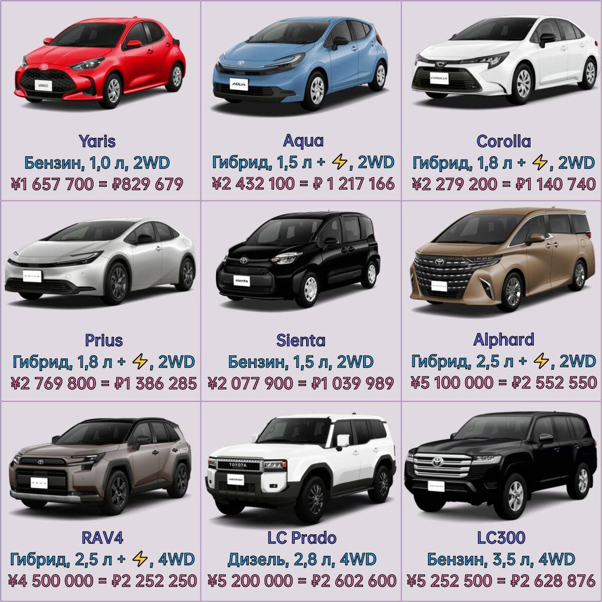 Вот для наглядности актуальная табличка с ценами на новые автомобили Toyota в январе 2026 года. Это уже финальная цена со включенным налогом.