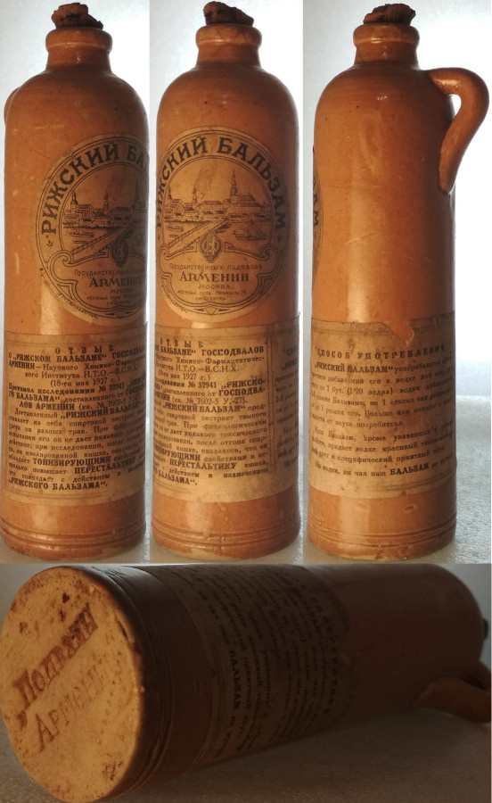 - Для алкогольной продукции это были бутылки для Рижского чёрного бальзама: Исторически это были характерные глиняные/керамические бутылки, производившиеся, например, для аптекаря Кунце, которые позже сменились стеклянными.