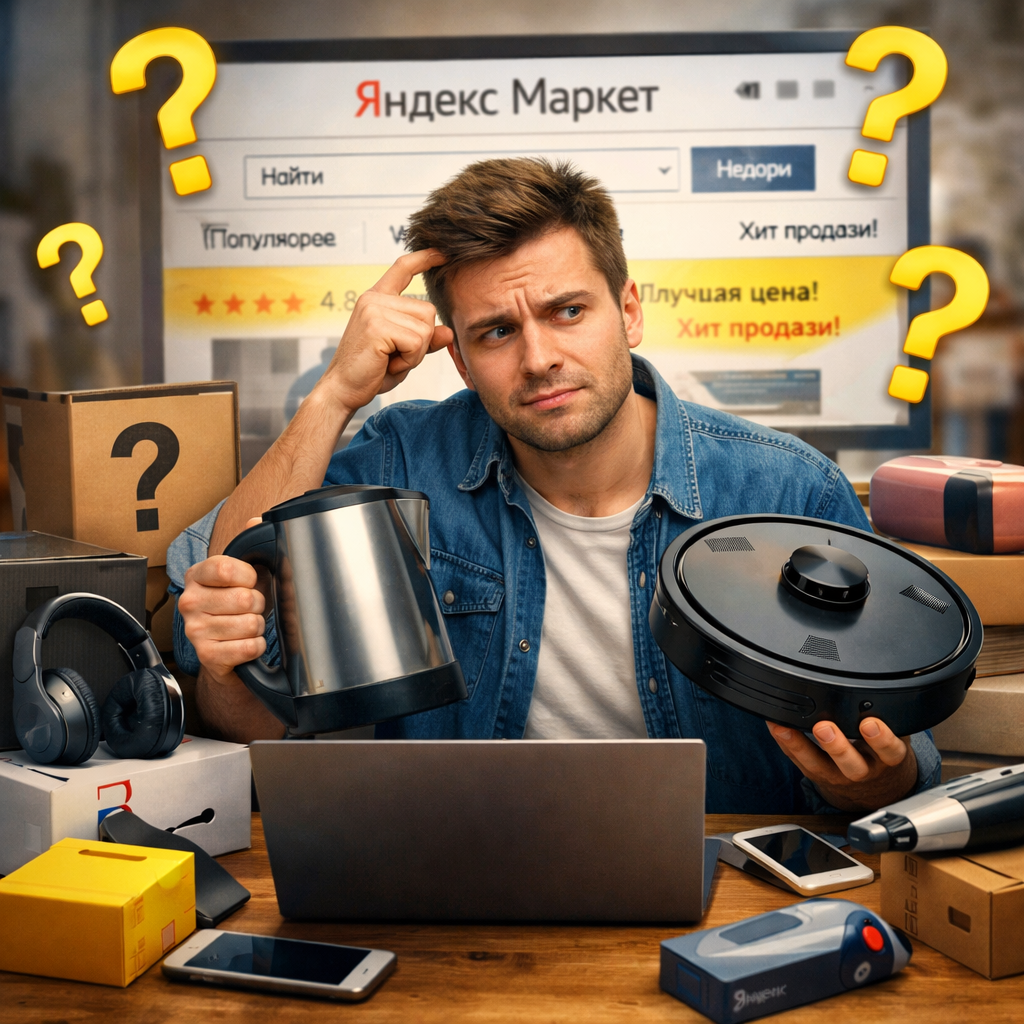 человек открывает Яндекс Маркет, вводит запрос, сортирует по «популярности» или «дешевле» — и оформляет заказ.