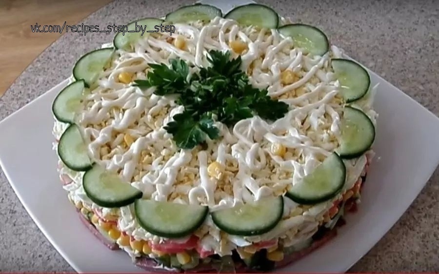 Ставим на тарелку металлическое кольцо. Благодаря ему салатик будет иметь красивый внешний вид. Затем выкладываем продукты слоями в таком порядке: колбаса, огурцы, 1/2 зеленого лука, кукуруза, крабовые палочки, яйца и украшаем оставшимся зеленым луком и половинками огурца.